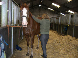3. Als ik weet waar zich de onbalans bevindt, ga ik behandelen. Voordat ik ga behandelen kijk ik of het paard zo veel mogelijk ontspannen is, anders probeer ik dit te bereiken door een massage te geven.